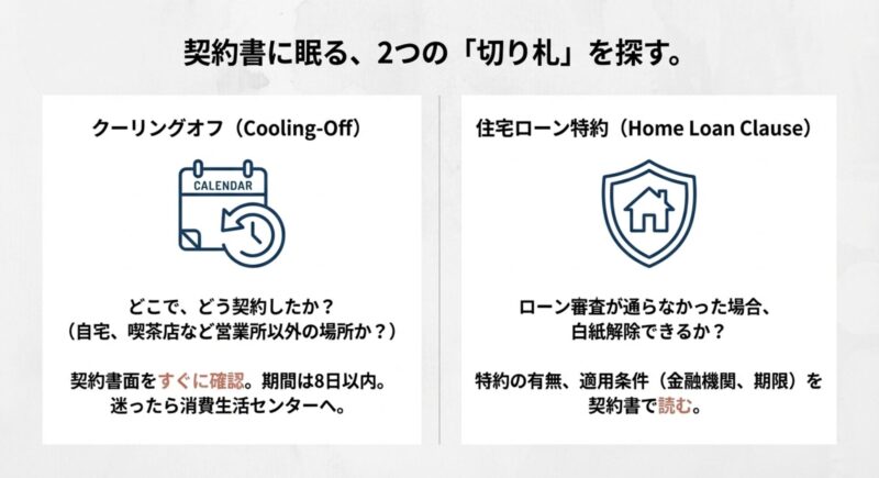 クーリングオフや住宅ローン特約が使えるなら最優先で確認する。