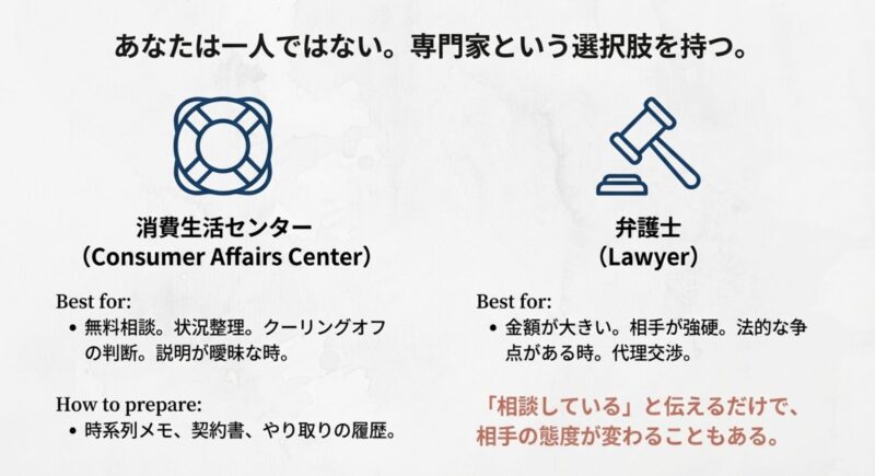 迷ったら、消費生活センターや弁護士など専門家への相談をおすすめします。