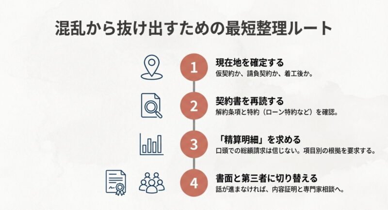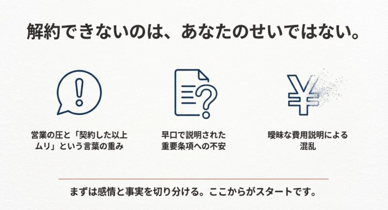 契約段階(仮契約・請負契約・着工後)と、営業対応・費用説明のズレが絡むと、解約が一気に難しく感じやすいです。