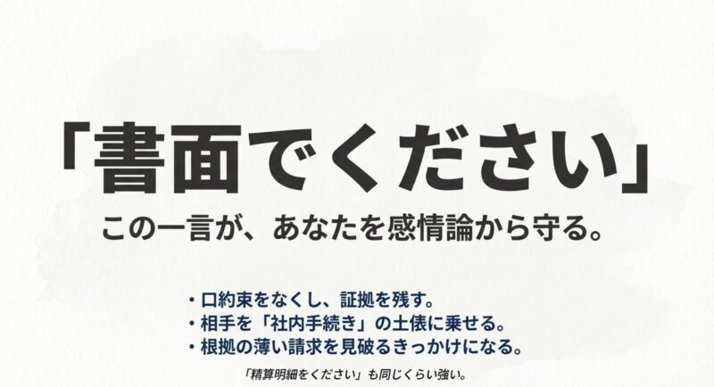 会話は、強く言うより「確認したいので書面でください」「内訳が分かれば判断できます」で十分です。