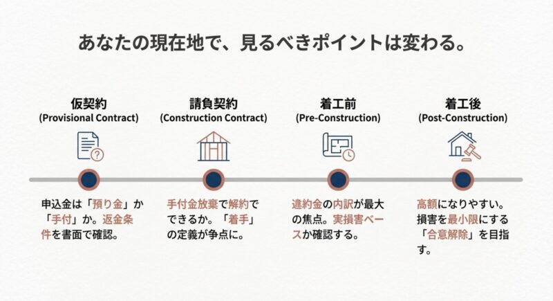 仮契約か、工事請負契約か、着工後かで、現実的な落としどころが変わってきます。