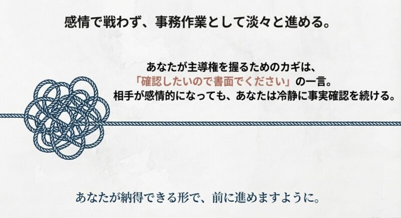 相手が感情的になっても、あなたは事務作業のテンションで進める方が結果が良いことが多いです。