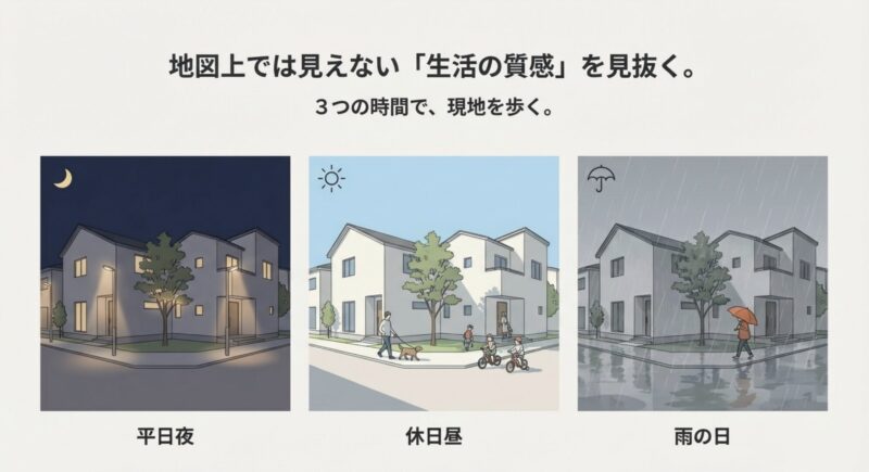 • 平日夜・休日昼・雨の日で現地確認する
